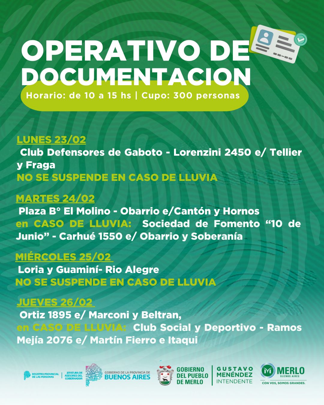 Del Lunes 23 y al Jueves 26 de Febrero de 10 a 15 hs podés tramitar de manera gratuita tu DNI a través de los “Operativos de Documentación” que organiza el Municipio junto al Registro Provincial de las Personas en diferentes puntos del distrito.