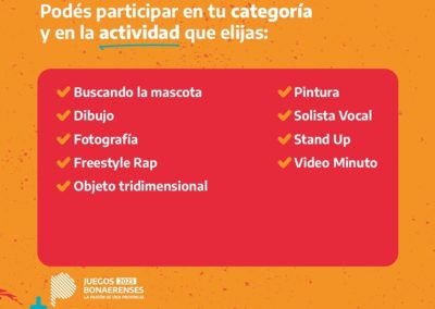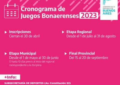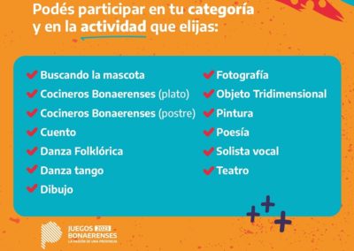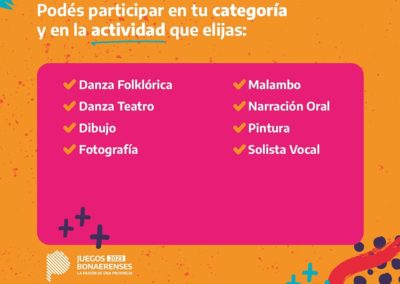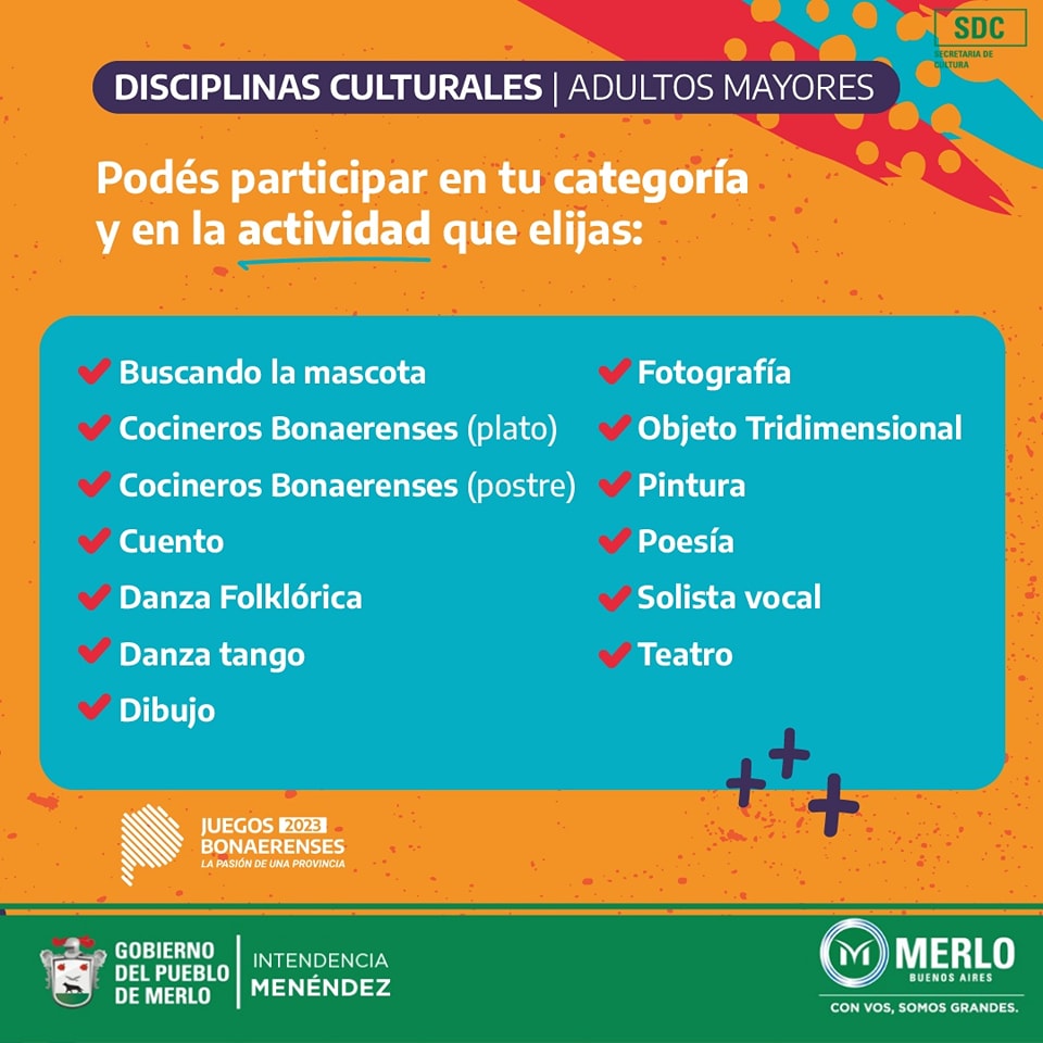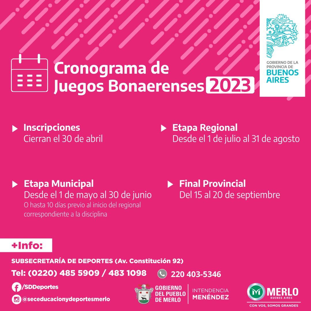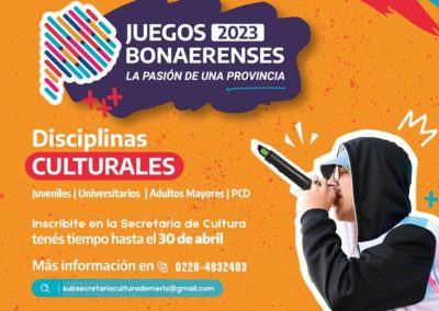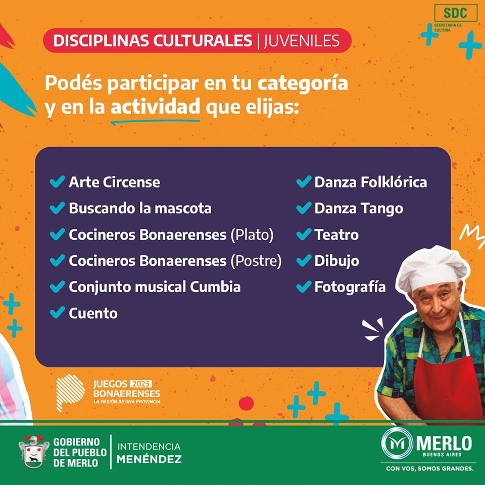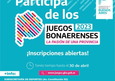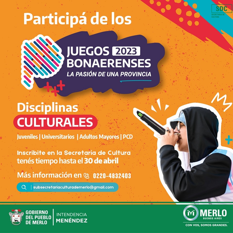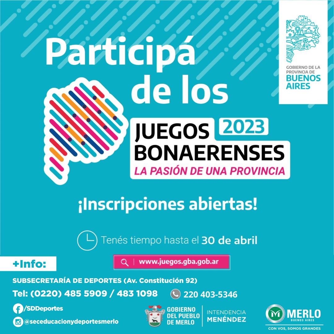 Comenzaron las inscripciones a los Juegos Bonaerenses. Tenés tiempo hasta el 30 de abril. Enteráte cómo participar. Para inscribirte ingresá a: https://juegos.gba.gob.ar/ o comunicate con la Subsecretaría de Deportes y la Secretaría de Cultura de Merlo.