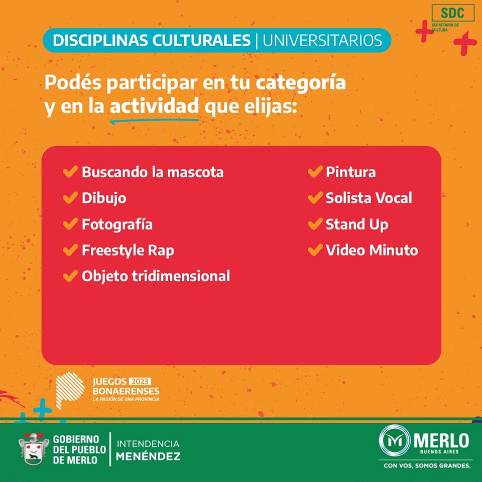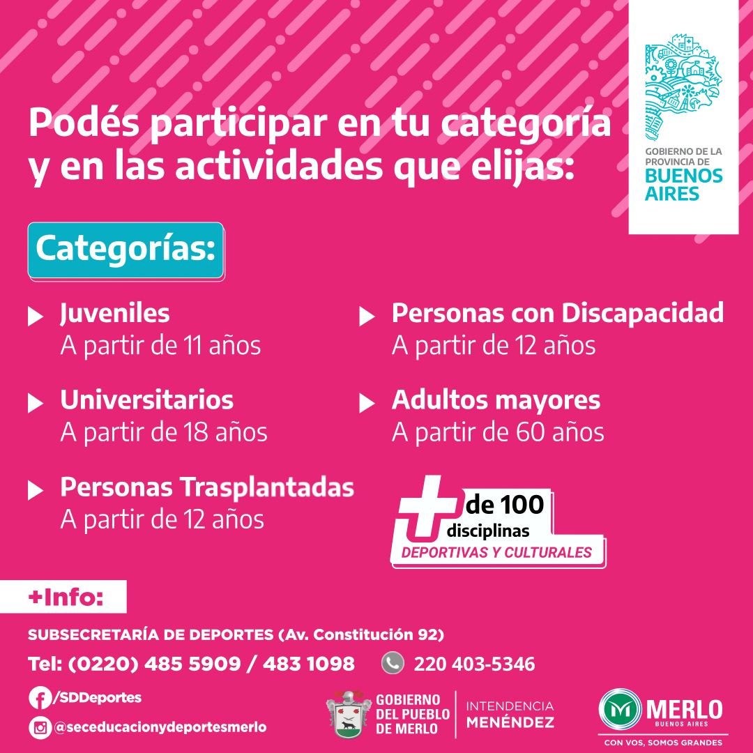 • Deportes – Universitarios: Estar cursando en Universidad o en Instituto Terciario (carrera de más de 3 años. Podrá inscribirse por domicilio en Merlo o representar a Universidad o Instituto con domicilio en Merlo.