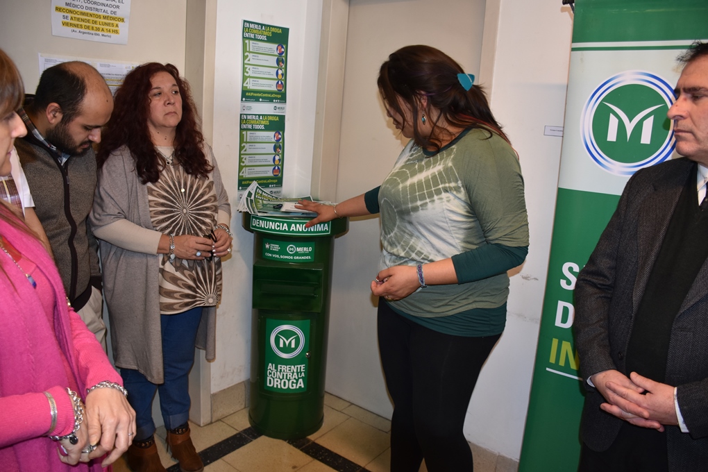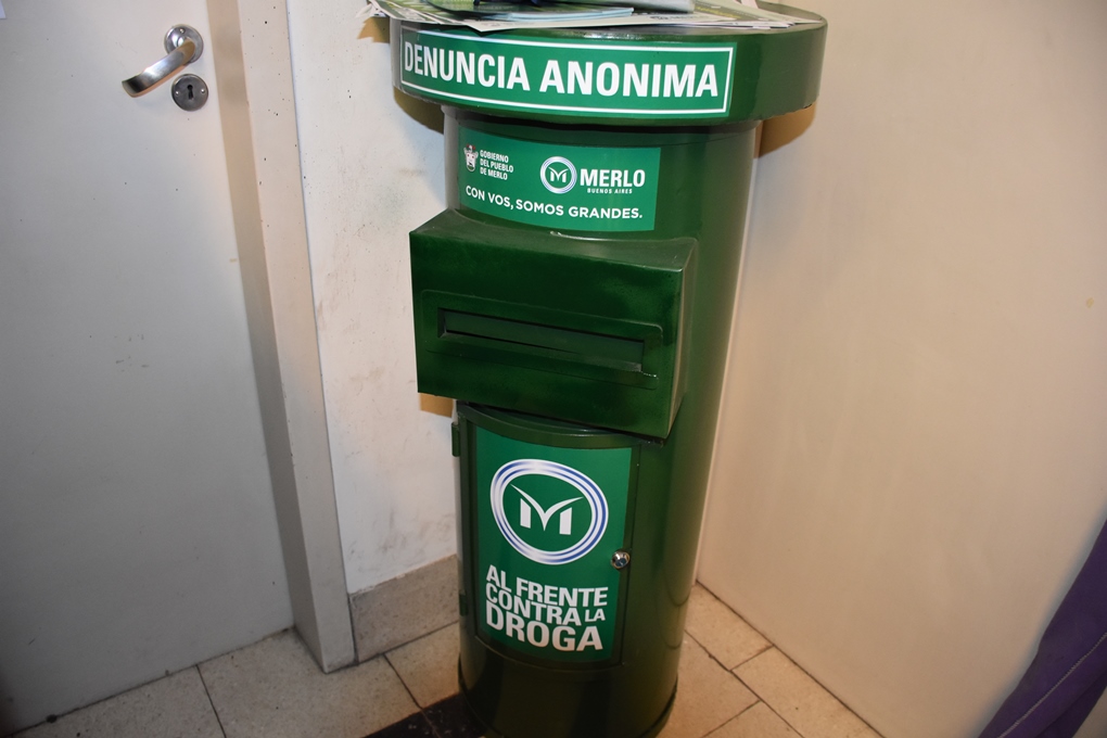 En el marco del plan “Merlo se pone al frente contra la droga” se instaló en el Consejo Escolar de Merlo, ubicado en Av. Calle Real 208, Merlo Centro, un nuevo Buzón Antidroga para que los vecinos puedan realizar de forma completamente anónima denuncias sobre los lugares en dónde se realiza venta de droga.