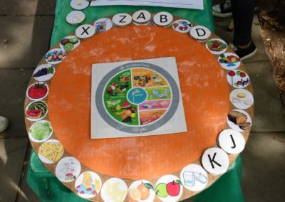 En el espacio de alimentación sana, a cargo de una nutricionista, se propusieron juegos para asimilar la importancia del consumo diario de agua, frutas, verduras, y múltiples consejos de salud para niñas, niños y adultos.