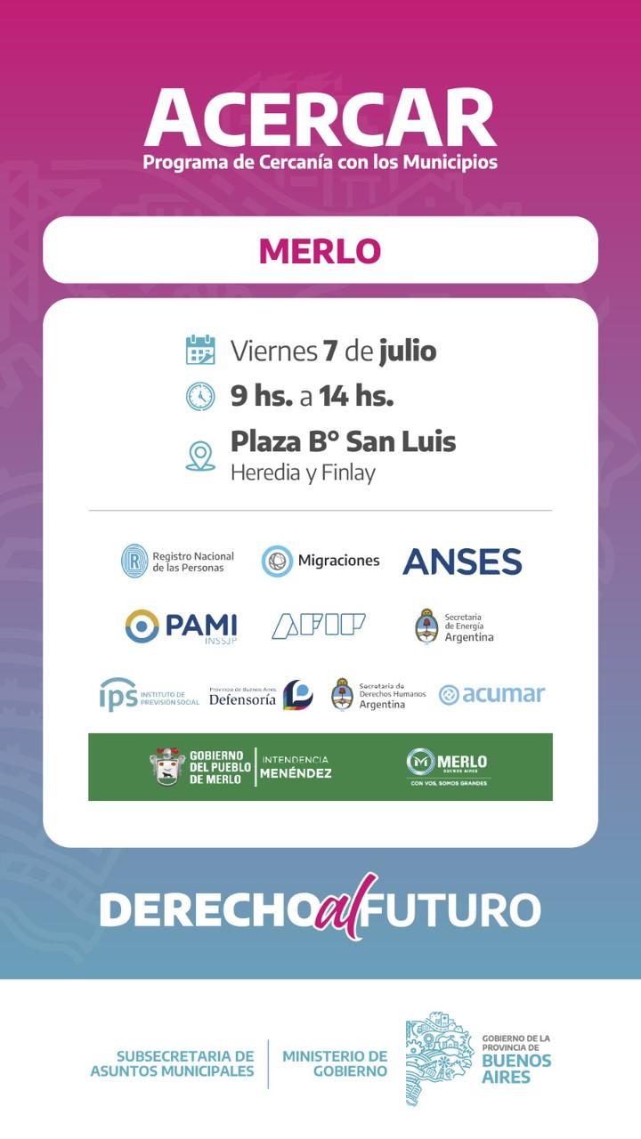 En Merlo, el Gobierno Municipal trabaja en conjunto con este programa y pone a disposición varias dependencias y áreas de gobierno como Salud, Desarrollo Social, Delegaciones, Educación y Deportes, Desarrollo Sustentable, entre otros, para asesorar e informar al vecino sobre beneficios, programas municipales y capacitaciones.