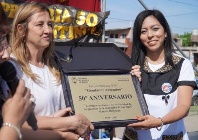 La Escuela Primaria N º50 “Gendarme Argentino” de Barrio Arco Iris cumplió 50 años y lo celebró con un acto para toda su comunidad educativa, que contó con la presencia de la Intendenta Karina Menéndez.