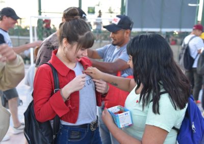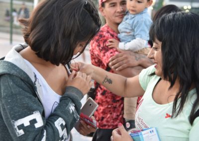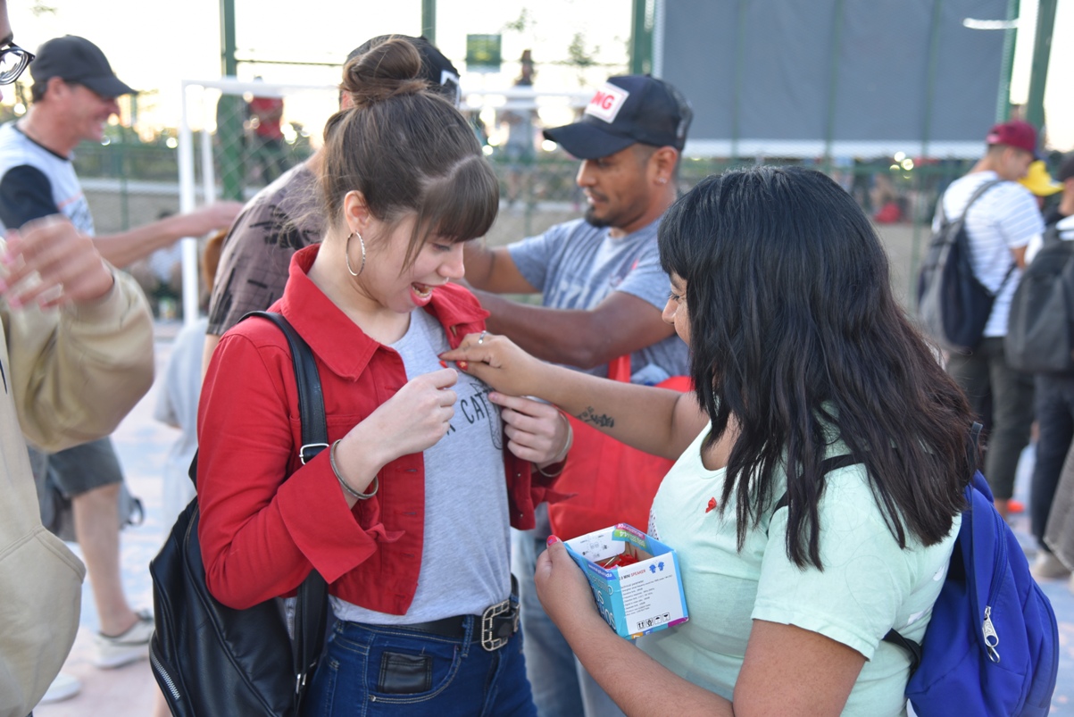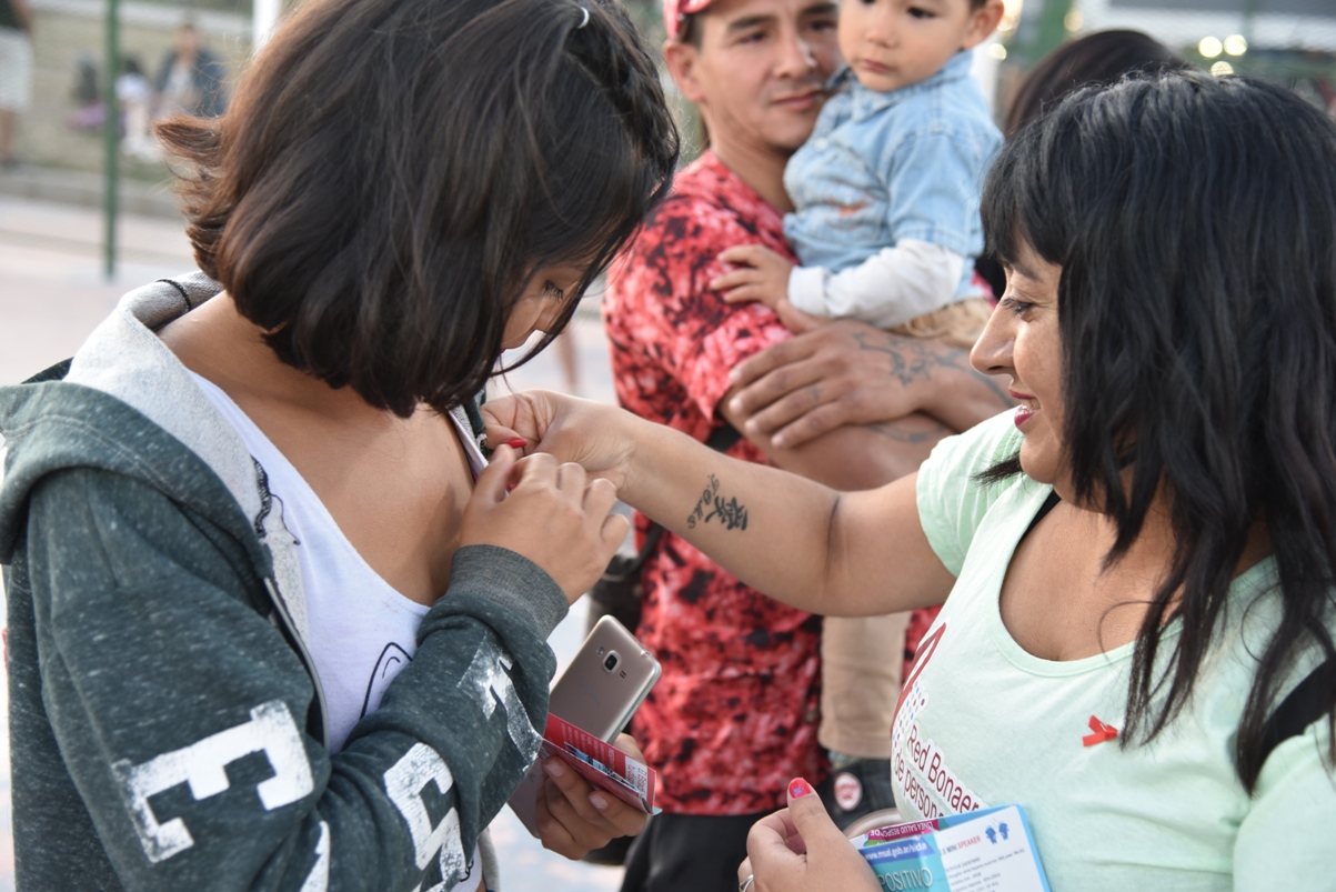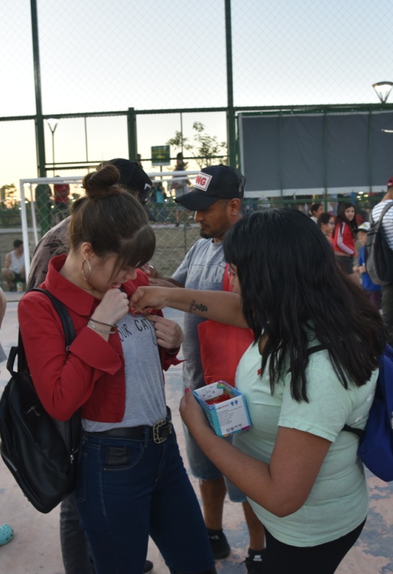 Repartieron lazos rojos, símbolo para mostrar apoyo a la lucha contra el sida y solidarizarse con las víctimas de la enfermedad y los portadores del VIH. También entregaron preservativos y folletería de prevención. Además de asesorar a las personas brevemente.