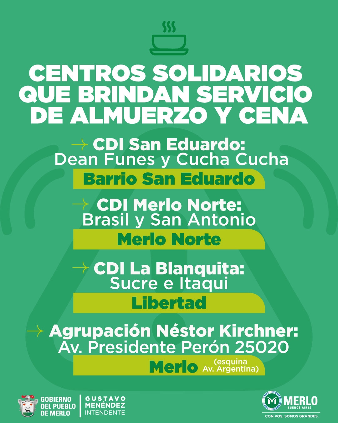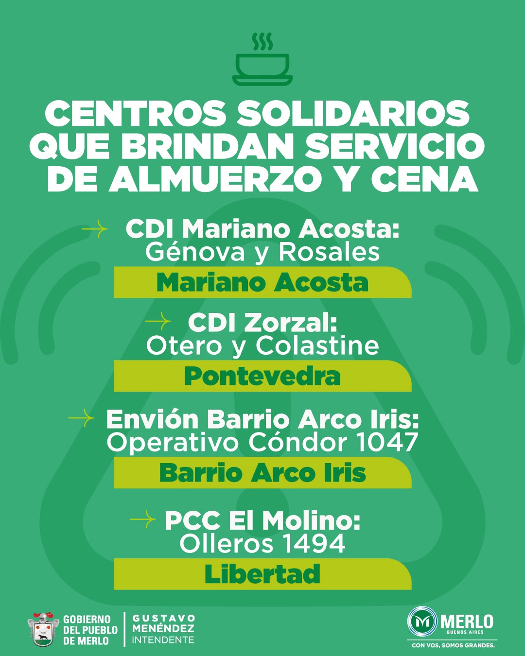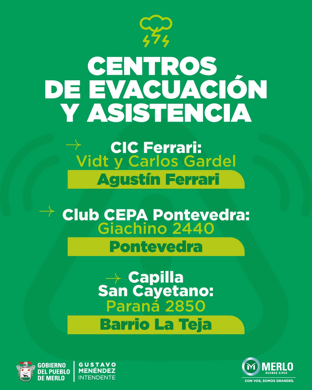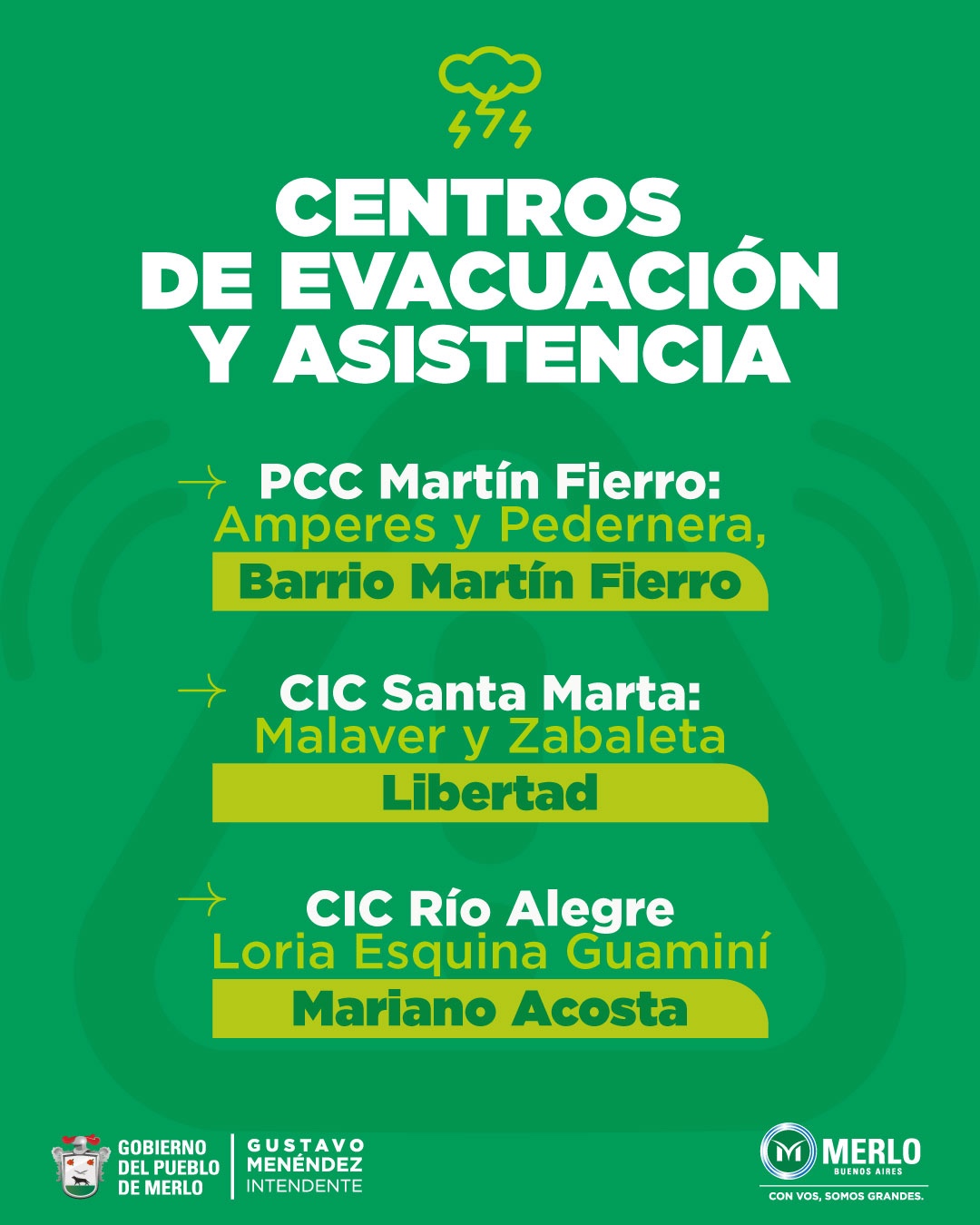 Los vecinos de Merlo que necesiten asistencia de carácter urgente como consecuencia del temporal, pueden acercarse a los centros solidarios y de evacuación: