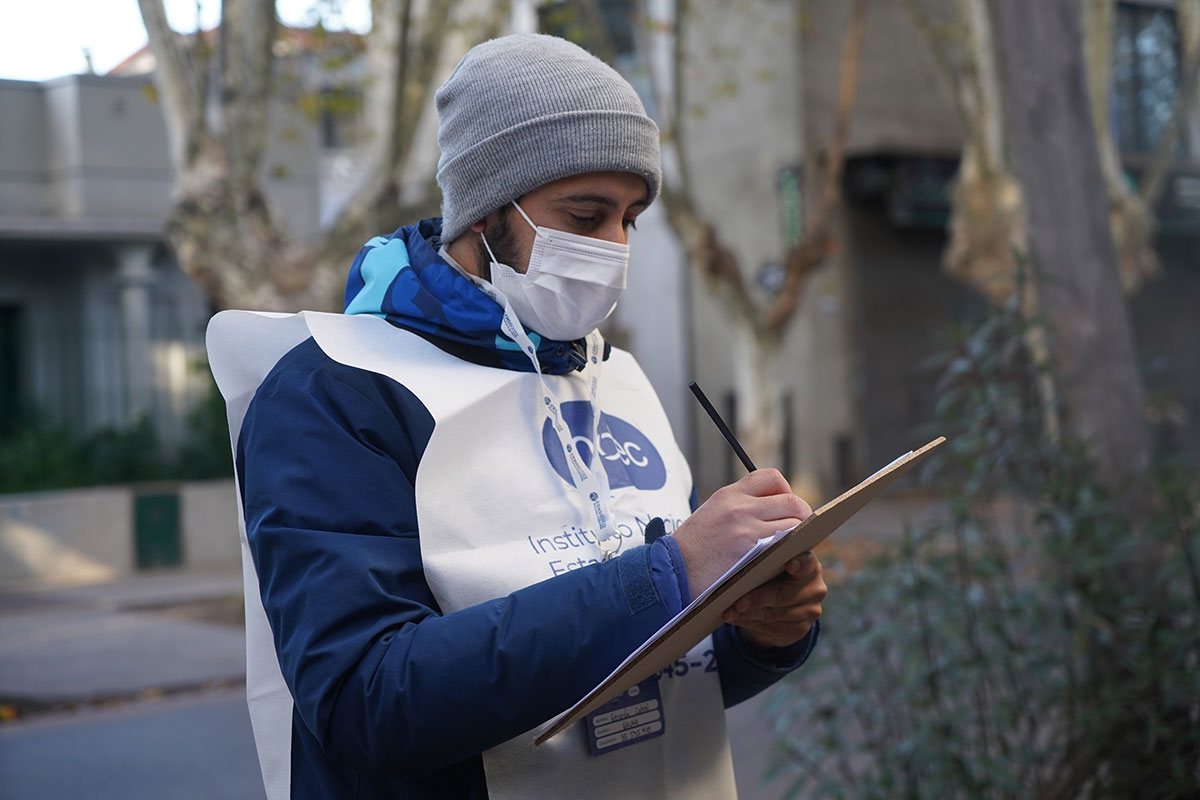 Durante el Censo Nacional de Población, Hogares y Viviendas 2022 los censistas visitan las viviendas para solicitar el comprobante del censo digital o realizar la entrevista tradicional. Tienen insignias que los identifican como personal genuino que lleva adelante el procedimiento: pechera, tarjeta con los datos del censista y código QR.