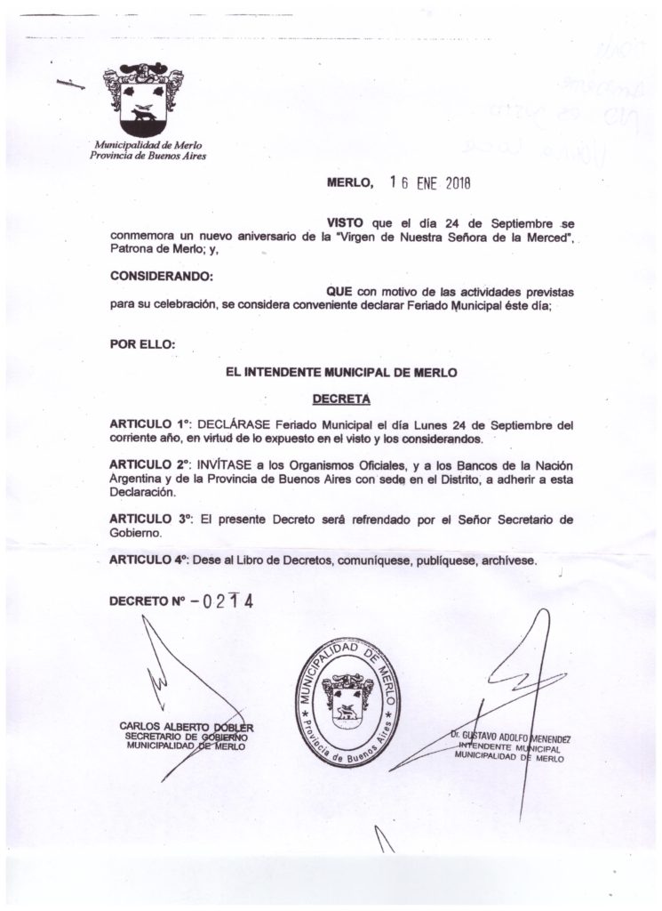 Se les comunica a los vecinos de Merlo, que el día 24 de septiembre se cumple un nuevo aniversario de la Virgen de Nuestra Señora de la Merced, Patrona de Merlo, motivo por el cual se decreta Feriado Municipal.