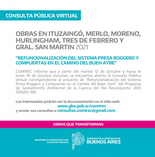 Se trata de la Consulta Pública Virtual del proyecto denominado “Refuncionalización del sistema presa Roggero y compuertas en el camino del Buen Ayre”, que se desarrollará en los municipios de Ituzaingó, Merlo, Moreno, Hurlingham, Tres de Febrero, y General San Martín.