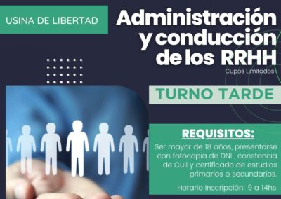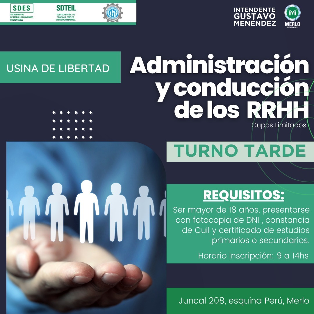 La Subsecretaría de Trabajo, Empleo e Integración Laboral abrió las inscripciones para el curso gratuito de Administración y Conducción de los RRHH. Los interesados deben presentarse a partir del Miércoles 10/04 en Juncal 208 esq. Perú, de 9 a 14 hs. Cupos limitados.
