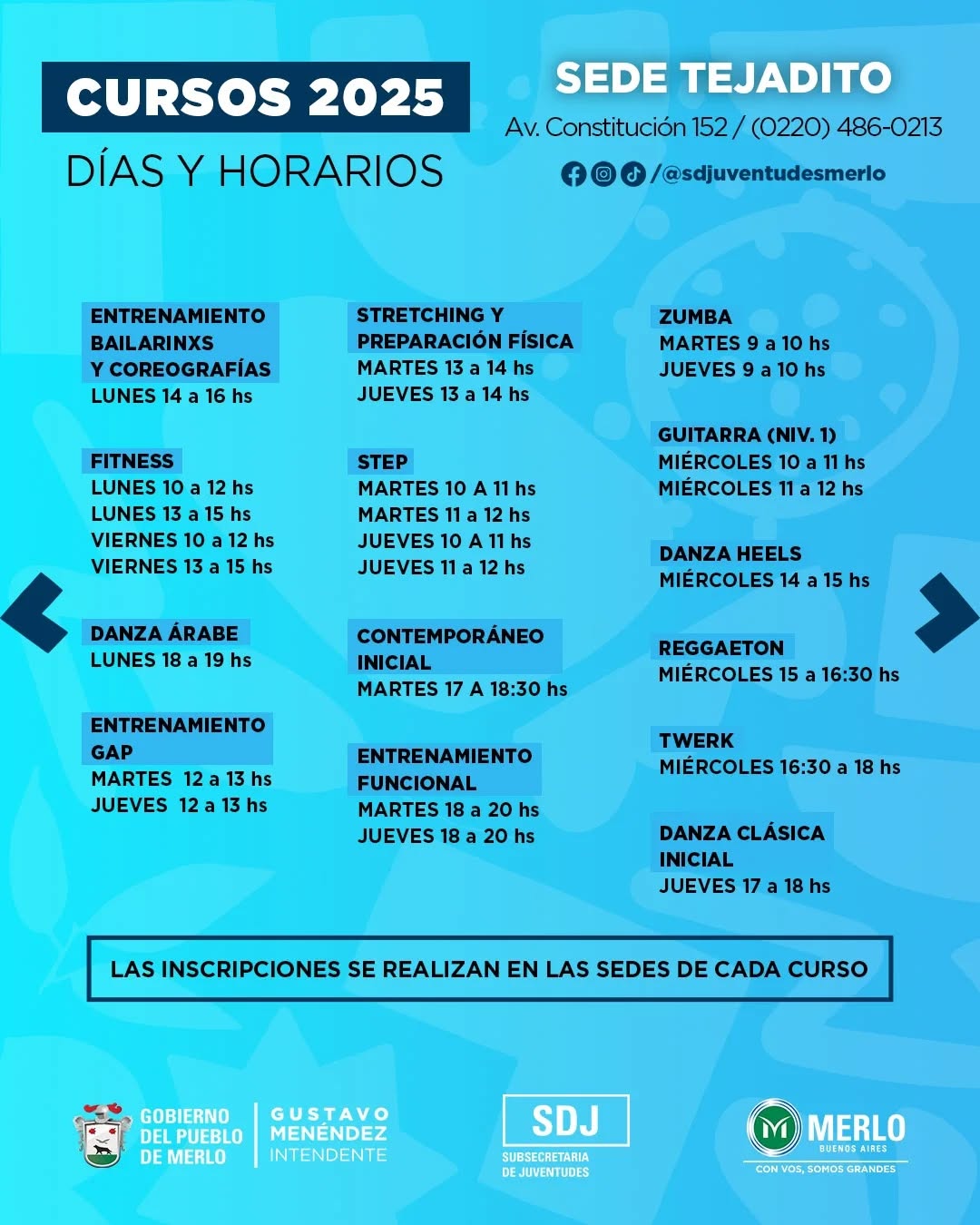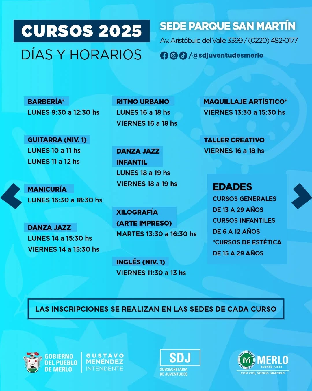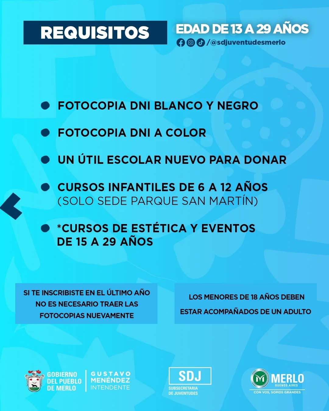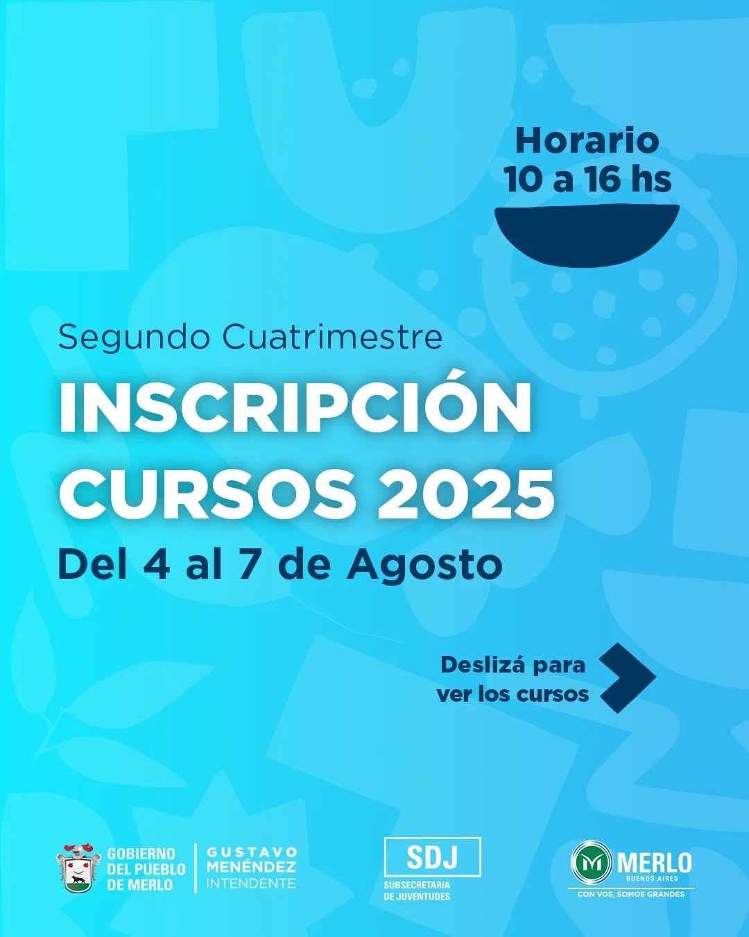 Los jóvenes de Merlo de 13 a 29 años pueden formarse gracias a los cursos gratuitos que la Subsecretaría de Juventudes brindará durante el segundo cuatrimestre del año. Del 4 al 7 de agosto, de 10 a 16 hs, en las Sedes del área. Acercar un útil escolar para donar.