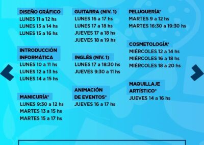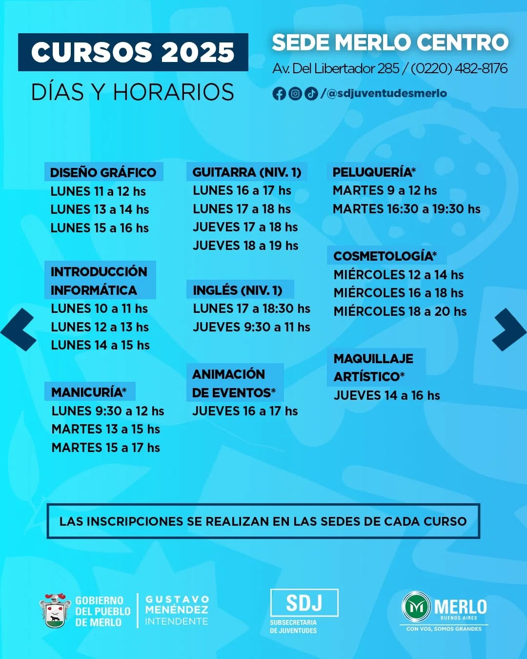 Estos cursos forman parte de la oferta académica que el área municipal a cargo de Natalia Luxen pone a disposición de los vecinos gracias a las políticas públicas del Gobierno Municipal, encabezado por el Intendente Gustavo Menéndez, en beneficio de la juventud merlense.