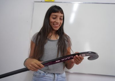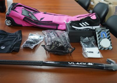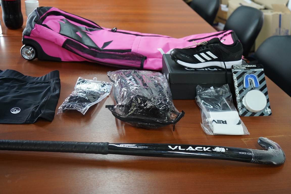 Luego del encuentro con Karina Menéndez las deportistas recibieron palo de hockey, bolsón, medias, zapatilla, canilleras, protección bucal e indumentaria