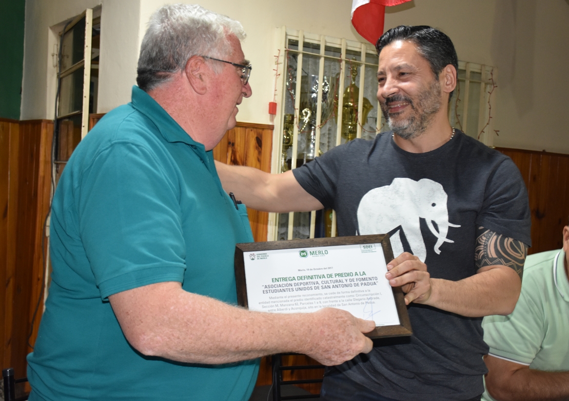 La Unión Vecinal La Esmeralda Sud y la Asociación Deportiva, Cultural y de Fomento Estudiantes Unidos de San Antonio de Padua fueron esta vez los beneficiados con esta política pública. Gracias a esta iniciativa del municipio de Merlo, estos clubes pueden seguir desarrollándose y creciendo sin preocuparse más por extender las prórrogas de los terrenos en los que funcionan sus instituciones.