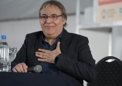 Por su parte, el guionista Eduardo Sacheri se presentó en la Sala Adán Buenosayres, donde compartió anécdotas sobre su trayectoria y sus obras, al tiempo que respondió preguntas de la audiencia.