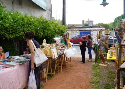 Los expositores ofrecen una variedad de productos, como tejidos, manualidades, dibujos, cuadros, bijouterie, mochilas, jabones aromáticos, indumentaria y artículos de librería.