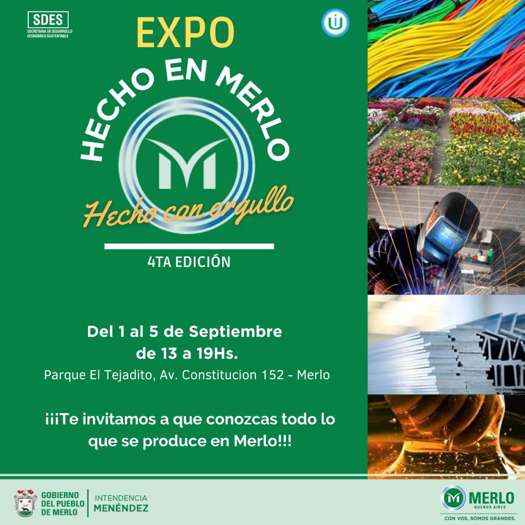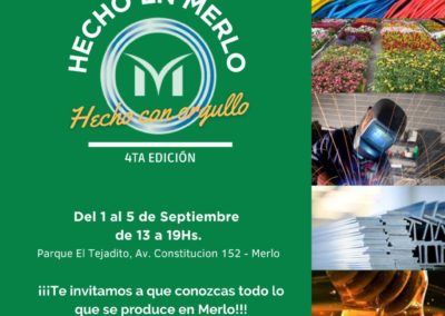 El Gobierno Municipal, a través de la Secretaría de Desarrollo Económico Sustentable, reúne a empresas, comercios y emprendedores locales en la Expo “Hecho en Merlo”, a realizarse del 1º al 5 de septiembre en el Parque El Tejadito, ubicado en Av. Constitución 152, de 13 a 19 hs, con entrada libre y gratuita.