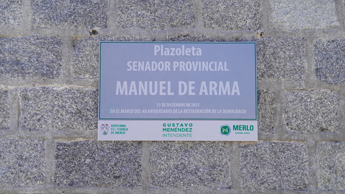 En el marco de los 40 años de democracia ininterrumpida en nuestro país, se realizó un acto en homenaje al Senador Manuel Jorge de Arma, con la inauguración de una placa honorífica en la Plaza del Mástil de Merlo. El Intendente Gustavo Menéndez y autoridades municipales participaron de la jornada.
