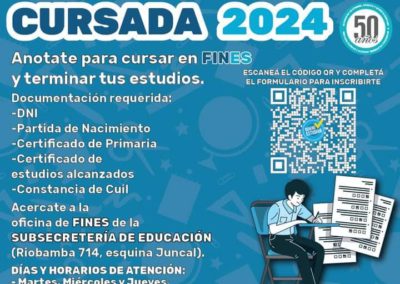 La Subsecretaría de Educación organiza una jornada de inscripción masiva al Programa Fines. Acercate el jueves 22 de febrero al punto más cercano a tu domicilio y anotate para finalizar tus estudios secundarios.