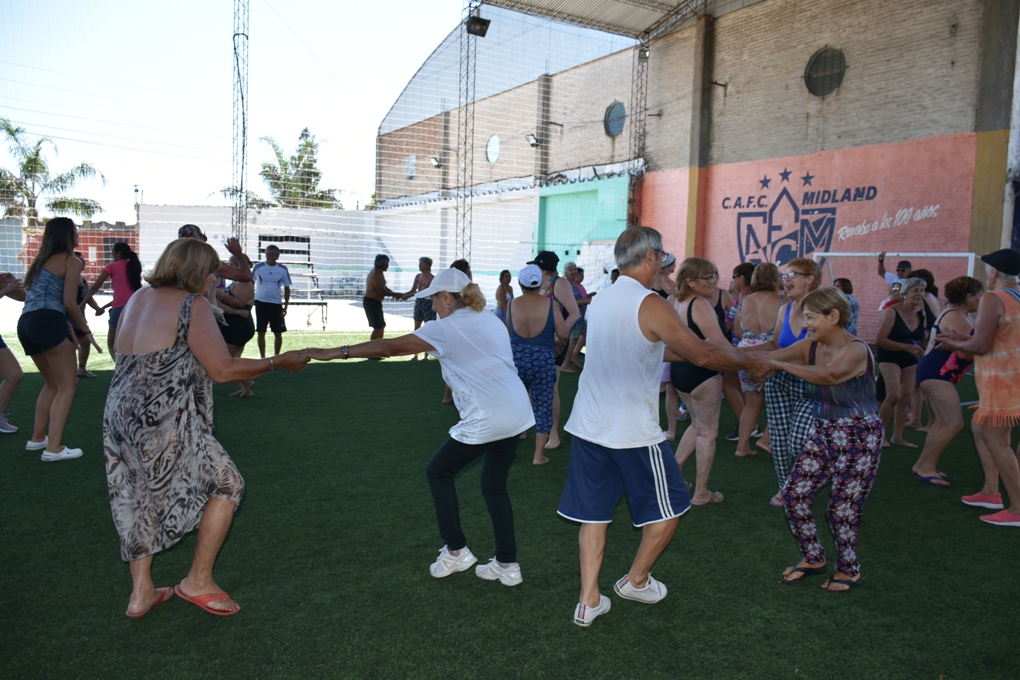 La recorrida comenzó temprano, cuando el jefe comunal se hizo presente en el Club Midland en una jornada de las Colonias para Adultos, donde los merlenses de la tercera edad disfrutan distinto tipos de actividades de recreación y comparten un día junto a sus pares.