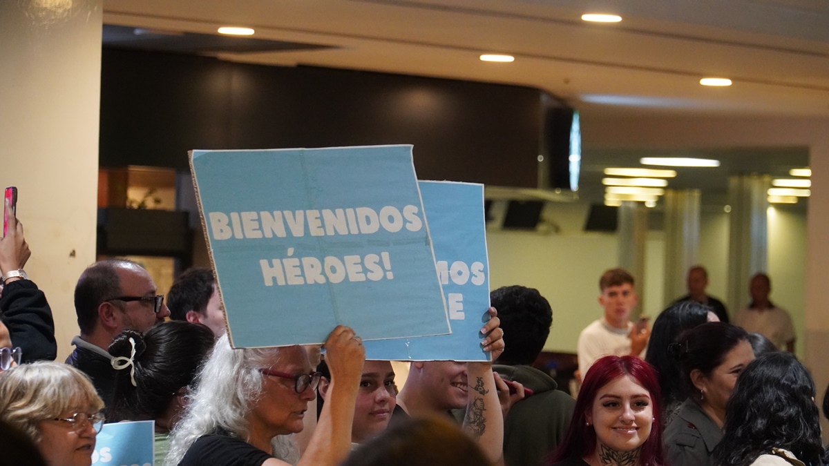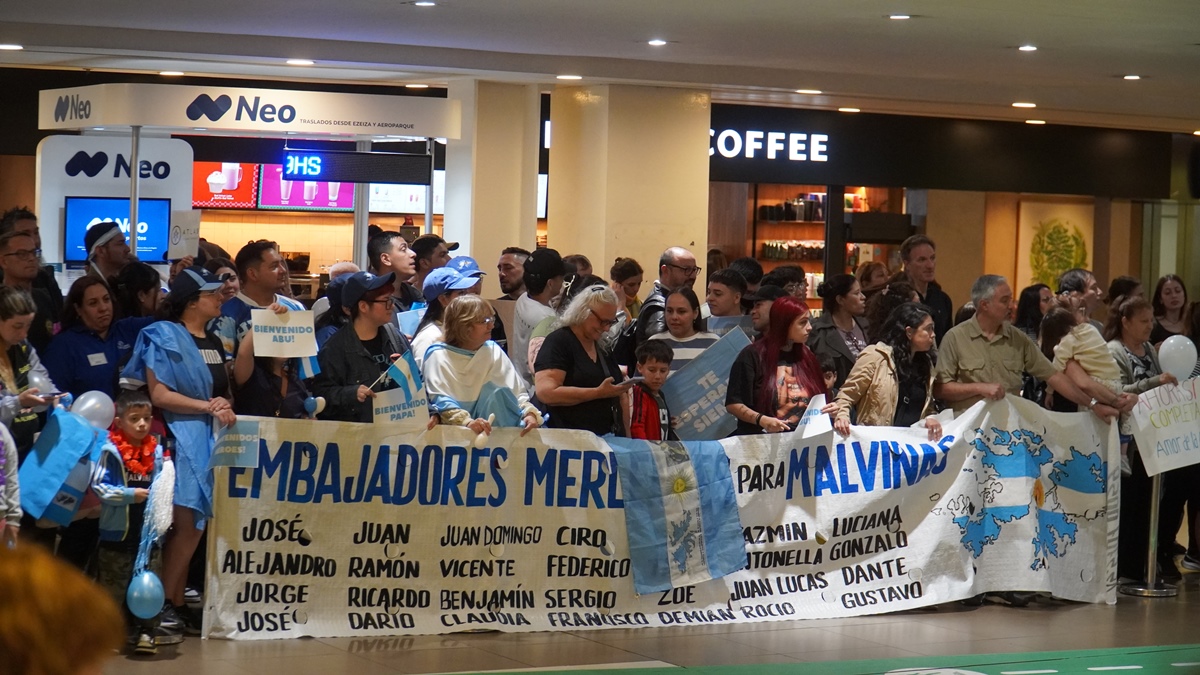 Los jóvenes ganadores del Concurso “Embajadores Merlenses por Malvinas” hicieron realidad su sueño de conocer las Islas y viajaron junto a Veteranos de Guerra para la realización de un documental. Esta mañana regresaron a Buenos Aires y fueron recibidos por familiares, autoridades, vecinos y medios de comunicación.