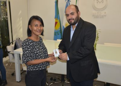 Nuevos trabajadores de atención al público del Gobierno del Pueblo de Merlo disponen de sus credenciales identificatorias, entregadas por la Oficina Anticorrupción.