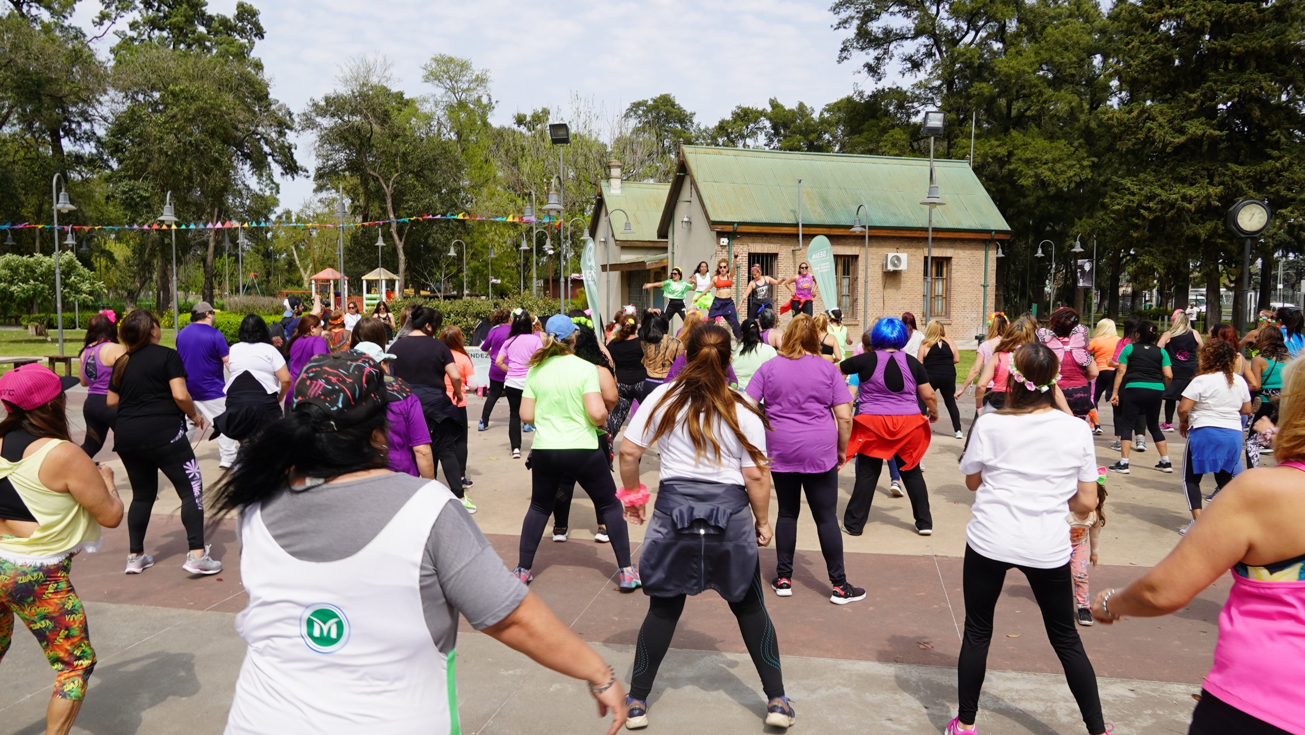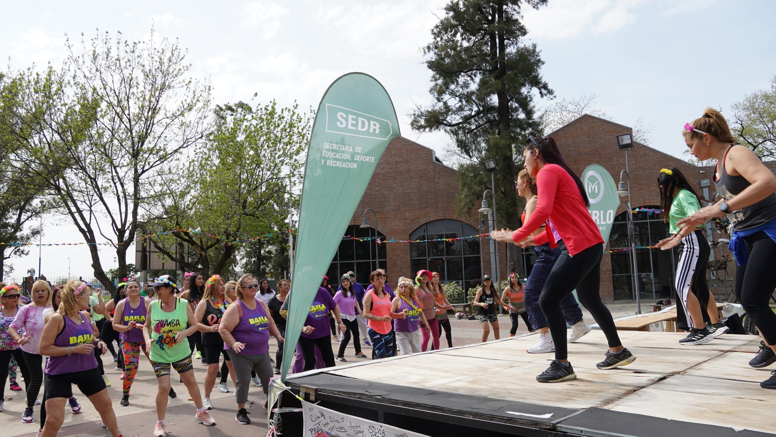 Vecinos y vecinas de Merlo participaron de la clase gratuita de Zumba organizada por la Subsecretaría de Deportes en el marco del Día de la Primavera, en el Parque Cultural de Libertad.