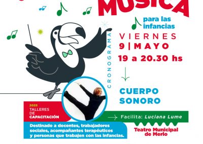 - Viernes 9/5 – 17:30 a 19 hs, Taller “Audición activa de músicas y canciones”, a cargo de Fernanda / 19 a 20:30 hs, Taller “Cuerpo Sonoro”, a cargo de Luciana Lume.