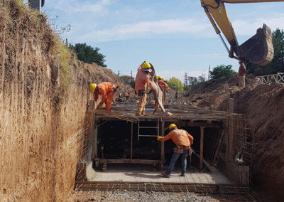 Ya demolido el puente de calle Solanet, se continúa con la construcción del conducto compuesto por dos celdas. A fin de optimizar el trabajo, se procedió a desviar el curso del arroyo Salguero, el que actualmente corre en forma paralela al antiguo cauce.