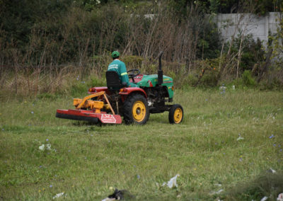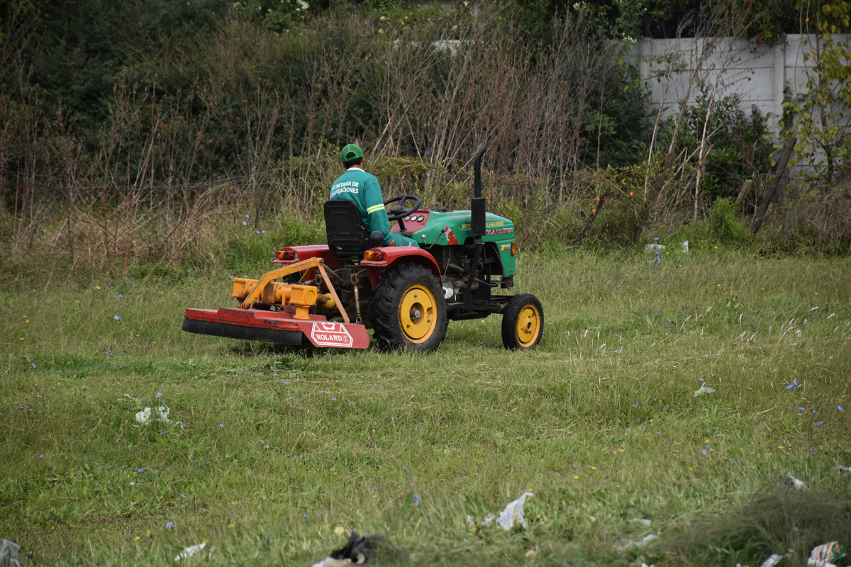 Las cuadrillas de trabajadores municipales se desplegaron por la zona con maquinarias Roland especializadas para espacios verdes, cortadoras de pasto y bordeadoras para un eficaz resultado. Utilizaron rastrillos para el acopio del césped cortado.