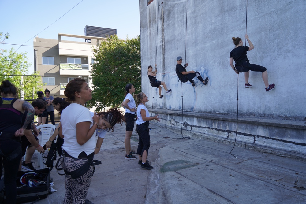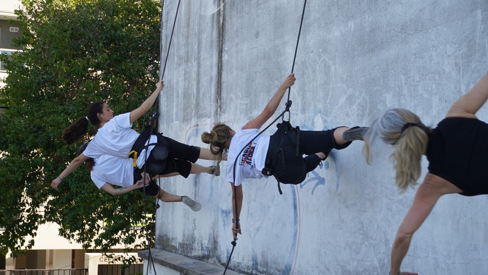 La jornada de aprendizaje, a cargo de la escuela “Caro Aérea” tuvo por objetivo difundir y generar acercamiento a esta actividad que combina la danza clásica contemporánea con herramientas de arneses, cuerdas y mosquetones.