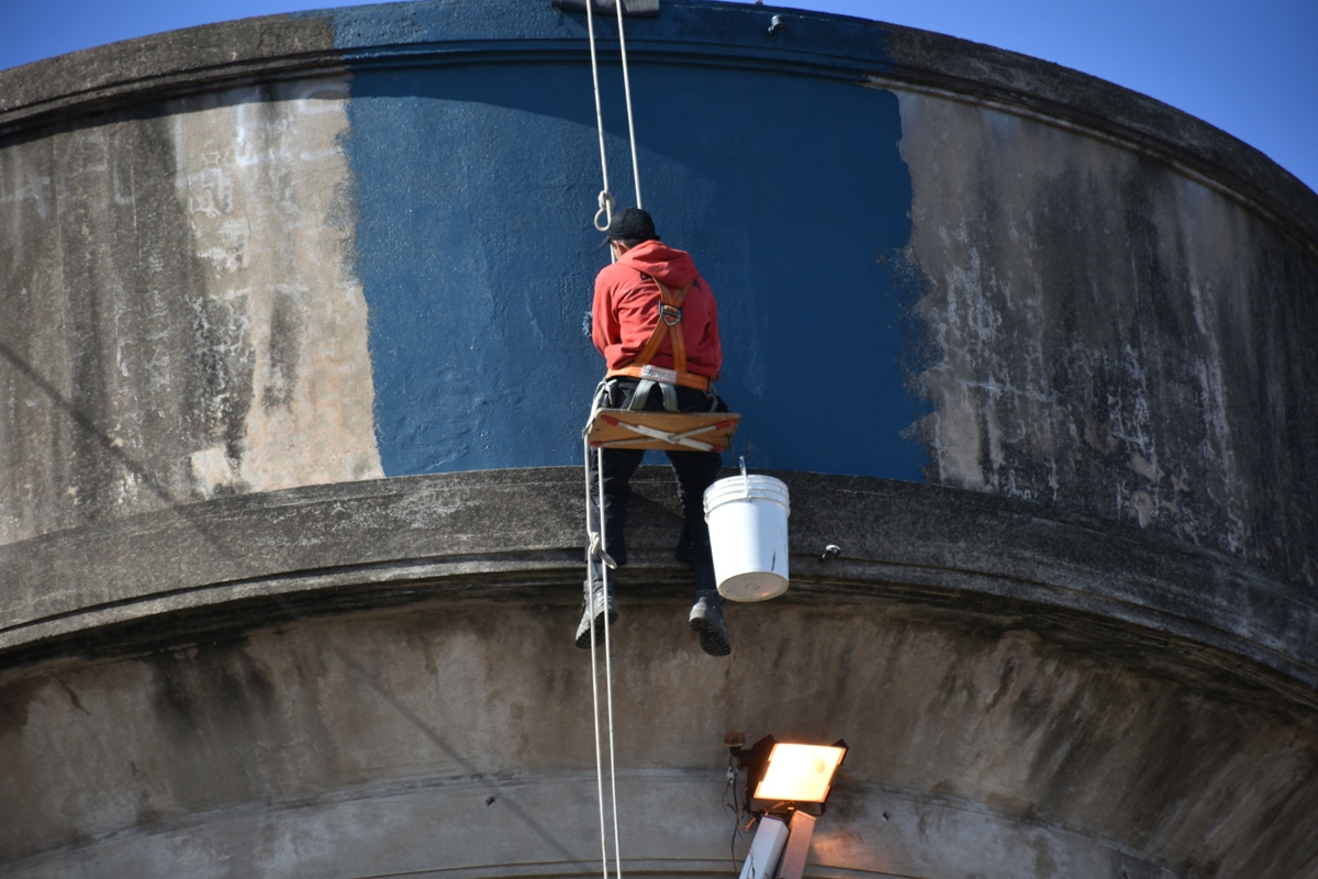 Ubicado sobre las Calles Italia y Dr. Raúl Ricardo Alfonsín, el trabajo que ejecutan en el predio los empleados municipales consiste en modernizar la sala de máquinas, el tanque, y el monumento, además de la construcción de veredas perimetrales, la iluminación y la parquización de la zona.