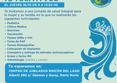 • Jueves 16 de Octubre, de 9 a 13:30 hs  Centro de Jubilados Rincón del Lago – Alberti 290 e/ Güemes y Garay, Merlo Norte