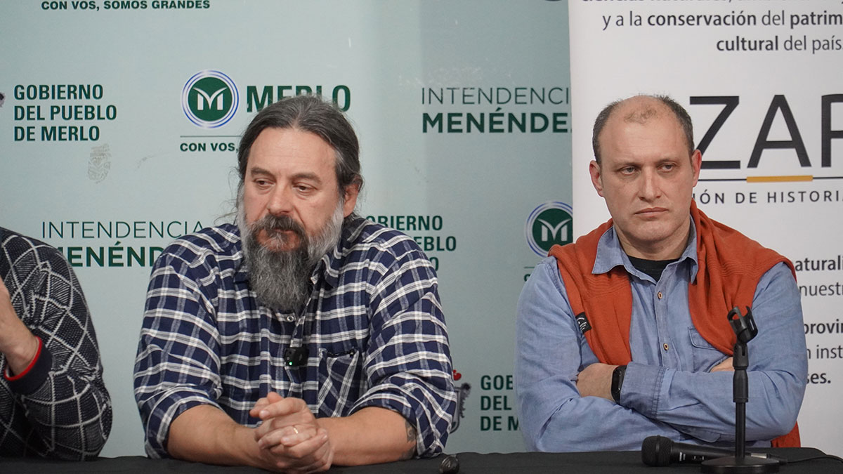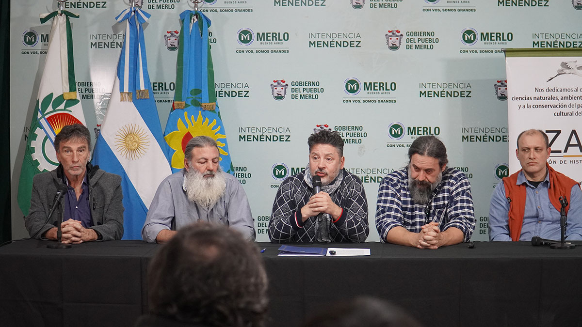La presentación contó con la participación de los investigadores y autores del trabajo a partir del hallazgo en Merlo, realizado por el paleontólogo Guillermo Jufré, curador del repositorio paleontológico merlense “Ramón Segura” y de los fósiles del Río Reconquista.